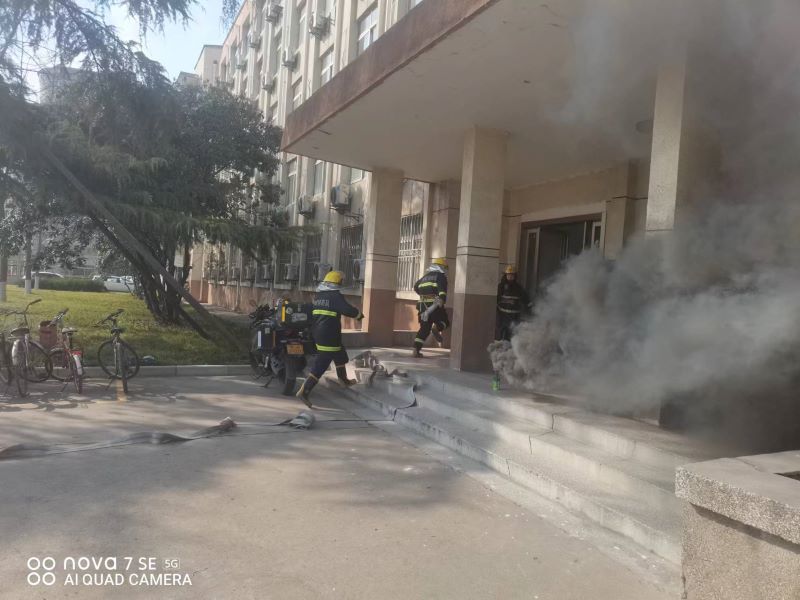 演练场景假设单身公寓一楼某配电室短路引发火灾,综合工作部楼宇管理值班员发现火情第一时间切断总电源,迅速组织义务消防员对火灾进行初始处置,同时楼宇班工作人员按照预案分工迅速到达各楼层指定位置,组织全体人员有序疏散,火势迅速蔓延,值班员报火警,公司专职消防队出警扑灭火灾,演练结束。